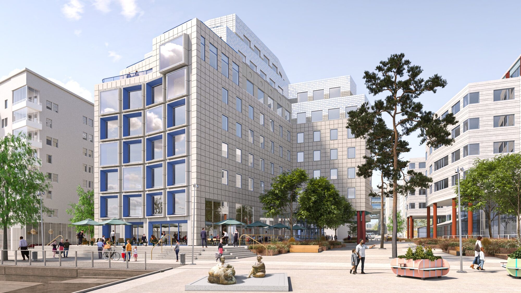 Signalhuset is part of Marievik’s architectural family tree – a collection of buildings where each individual has its own voice. Designed by Mischa Borowski in the early 1990s, the building is an expression of postmodernism’s playful language of forms: red columns, light blue square façade elements, and details in stainless steel. Here, architecture plays with geometry, proportions, and symbolism.