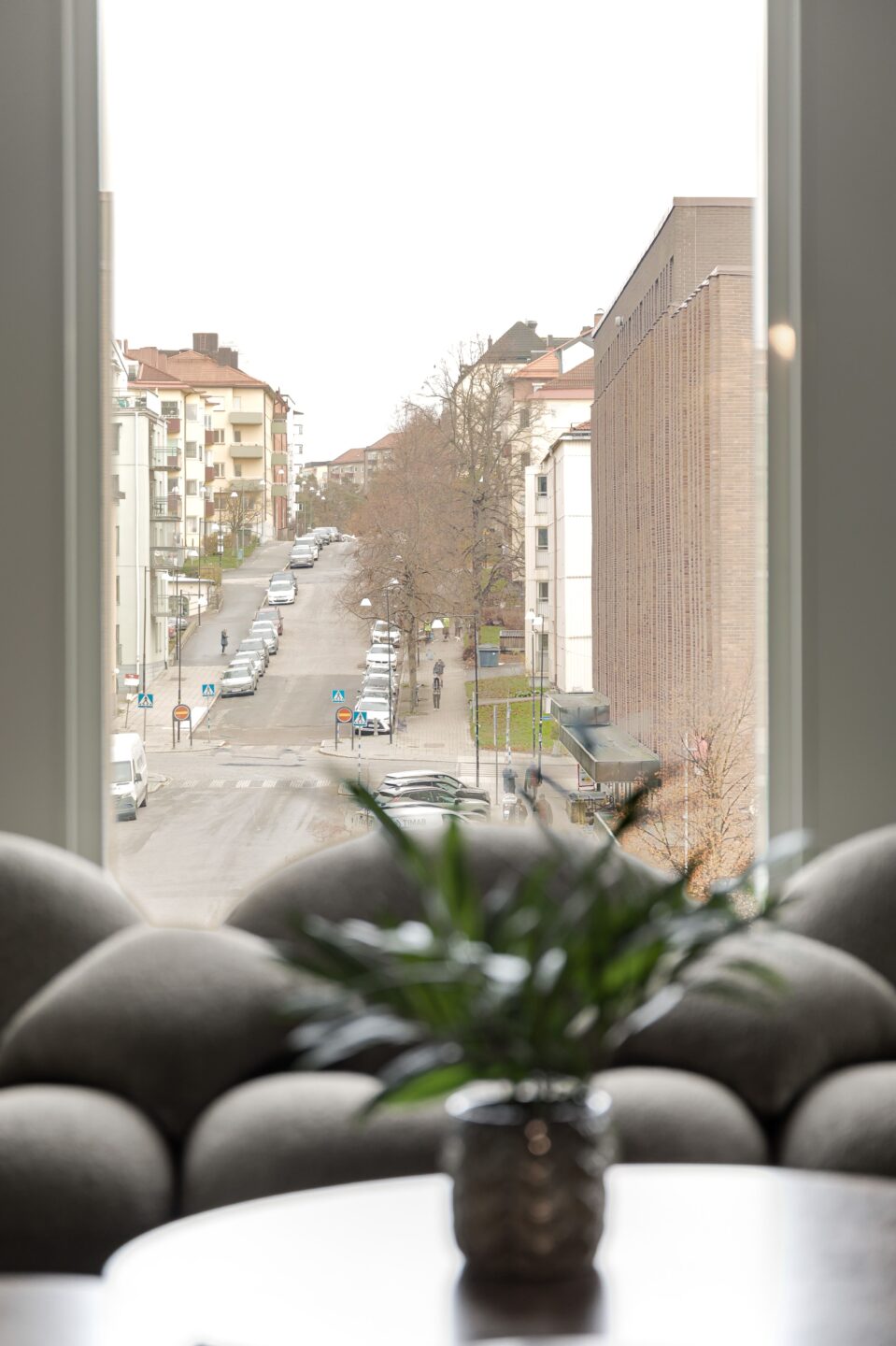 Lokalen sträcker sig över tre generösa våningsplan med stora fönster i flera väderstreck som fyller kontoret med ljus och bjuder på utsikt över centrala Sundbyberg och stadens takåsar. De öppna vyerna och det rika dagsljusinsläppet skapar en luftig och trivsam arbetsmiljö med tydlig närvaro av staden utanför.