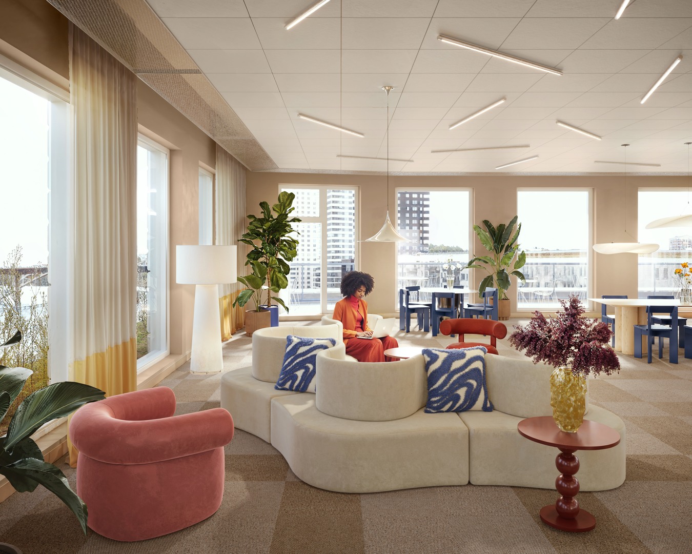 Interiören, signerad Kaminsky Arkitektur, är en hyllning till signalens många uttryck – färg, ljud, rörelse. Här blandas valnötsbetsade dörrar, korkbeklädda väggar, textilmattor i sobra toner och rostfria pentryn med geometriska former och färgstarka accenter. Ett flöde av design där varje rum är en plats för samtal, kreativitet och samarbete.