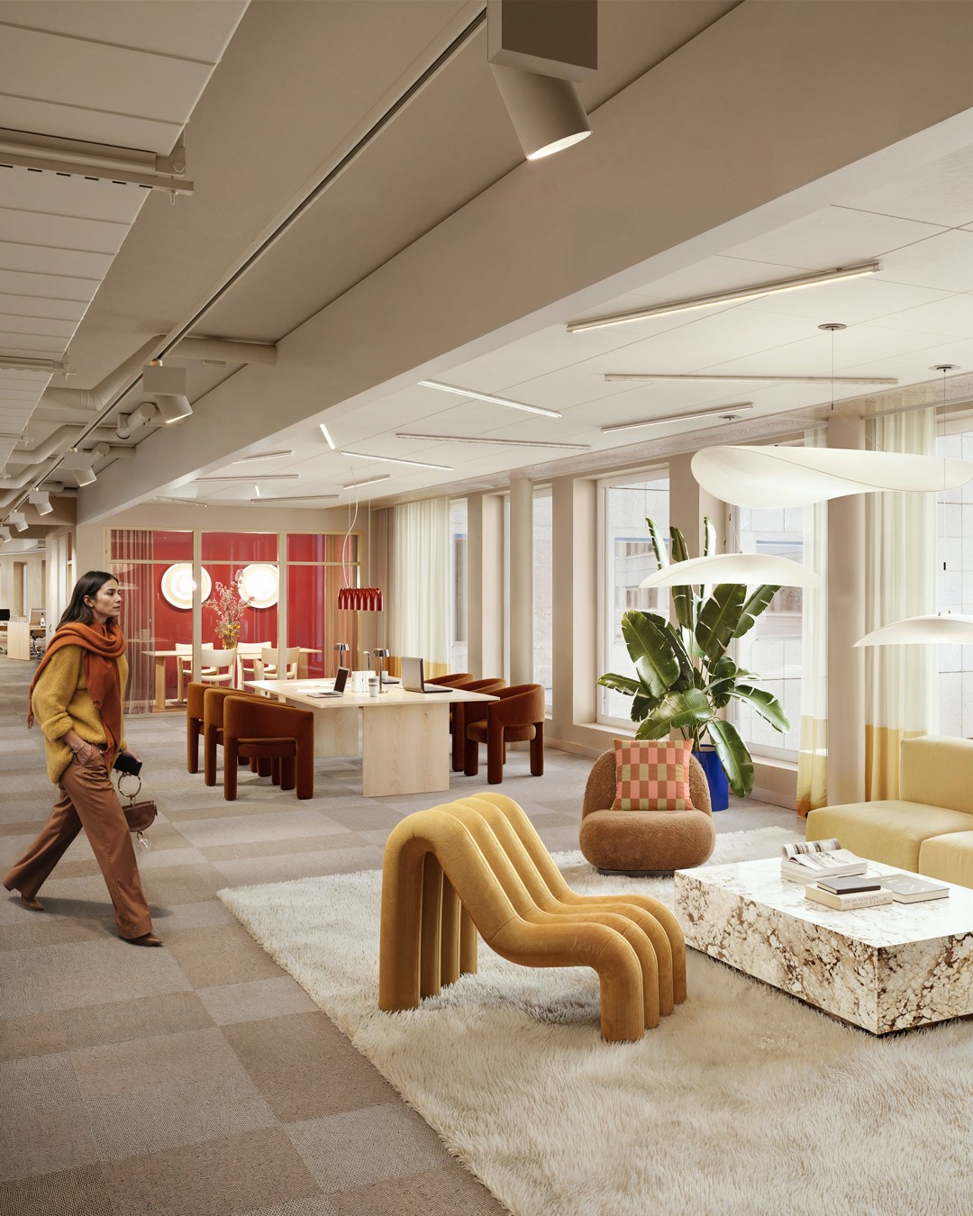 Interiören, signerad Kaminsky Arkitektur, är en hyllning till signalens många uttryck – färg, ljud, rörelse. Här blandas valnötsbetsade dörrar, korkbeklädda väggar, textilmattor i sobra toner och rostfria pentryn med geometriska former och färgstarka accenter. Ett flöde av design där varje rum är en plats för samtal, kreativitet och samarbete.
