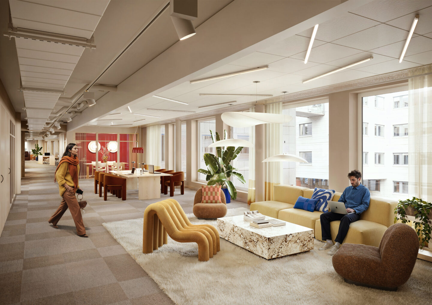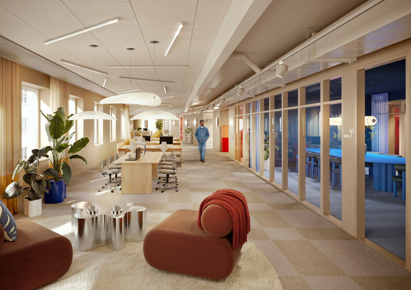 Vi skapar kontor som ger mer än bara arbetsytor. Nya fasadpartier öppnar upp mot vattnet, och två våningar i trä adderar värme och hållbarhet. Interiören blir lekfull och karaktärsstark – med grafiska golv, färgstarka mötesrum och material som berättar en historia.
